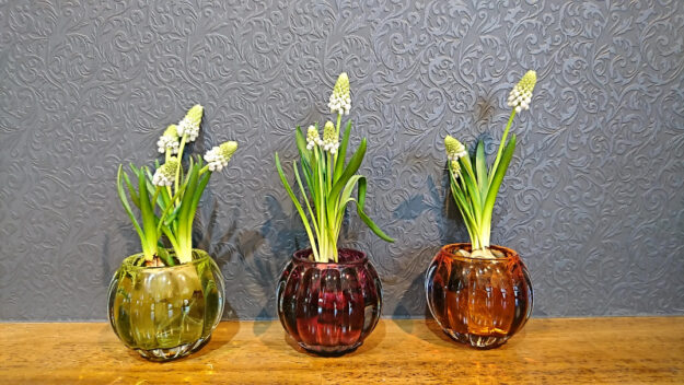 切り花のムスカリ(白花)が入荷しました❗ 球根付きです🎵 あまりに可愛いので、一つずつ キャンドルグラスにセットしてみました 何だか守ってあげたくなるような 可愛いさです💕