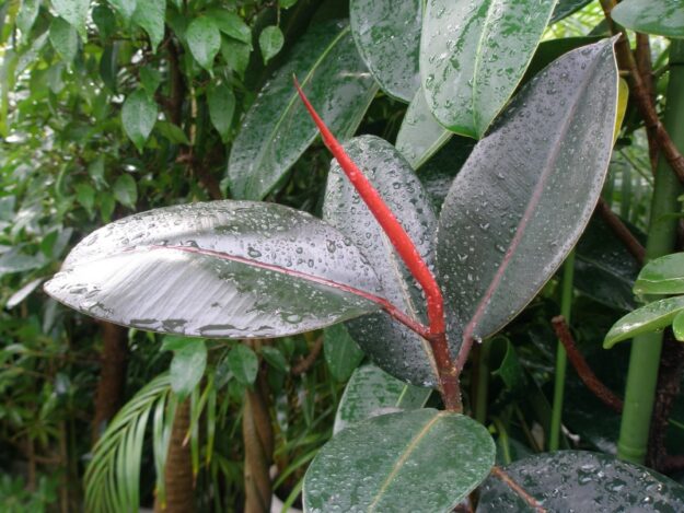 フィカス アビジャン(クロゴムノキ)。新葉は赤黒色を帯び光沢があります。