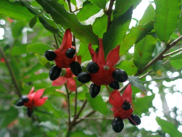 高さ5m以上になる常緑低木。葉はヤツデの葉に似ている。雌雄異株。