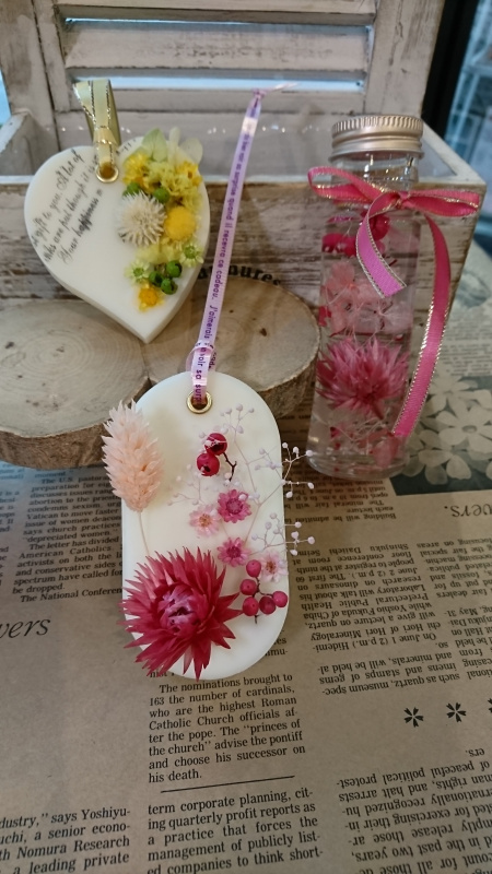 只今人気の アロマワックスサシェ皆様続々レッスン受講下さり、とっても可愛らしく素敵に制作されました❣️ ハーバリウムでもリピーター様、今回もお嬢様と仲良くハーバリウムも追加でお作り頂きました✨ こちらは、アロマワックスに…